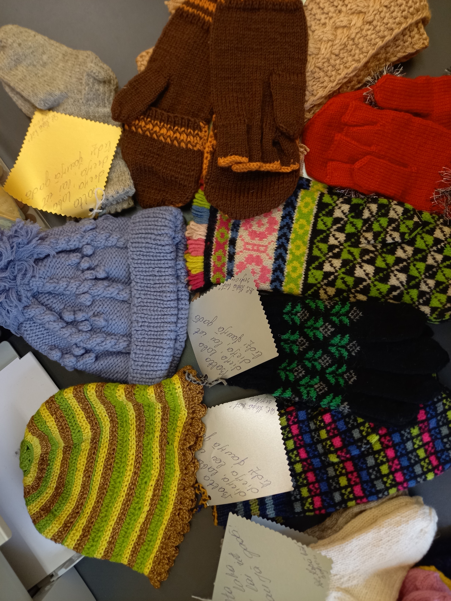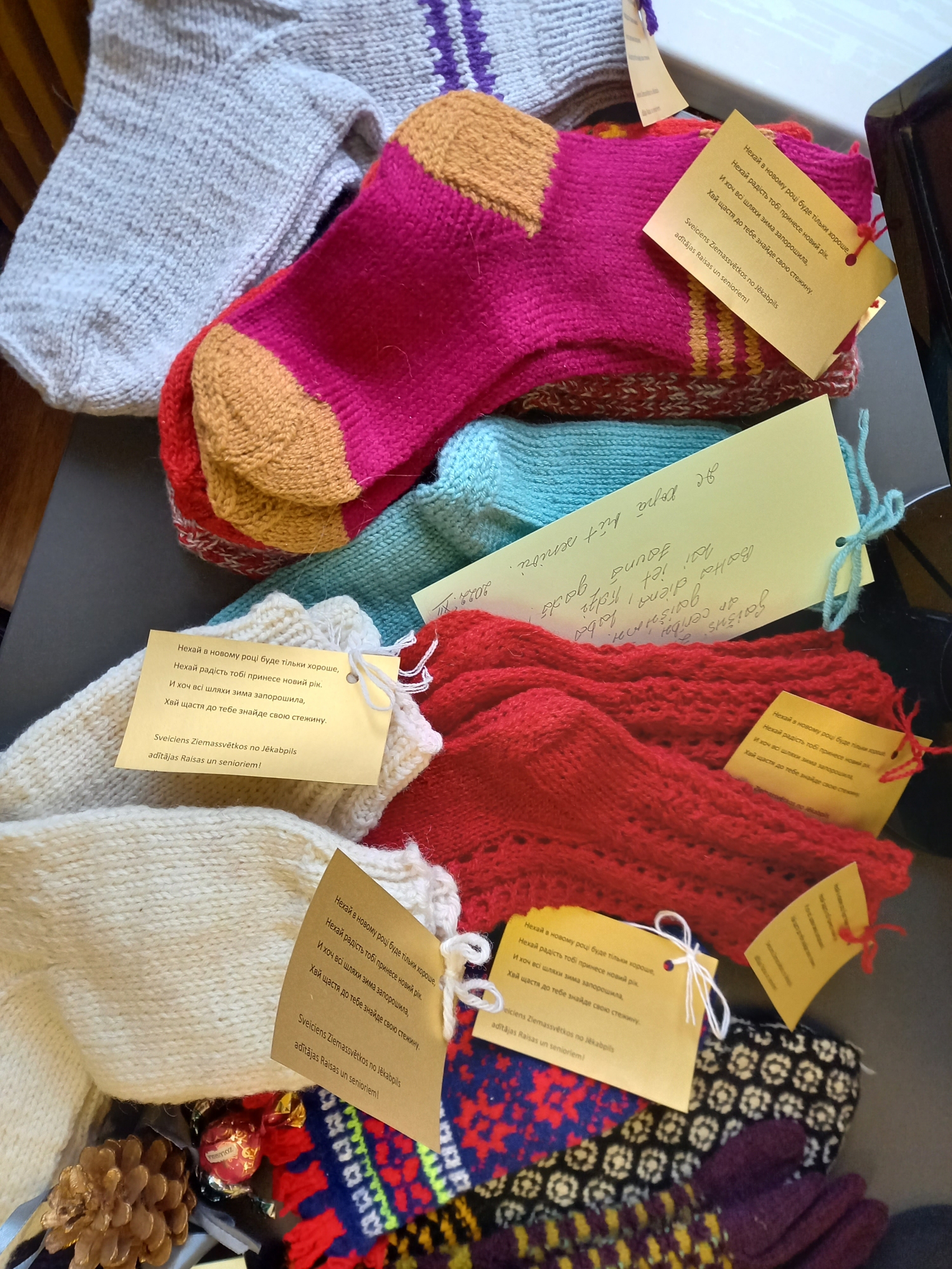 Šoreiz īpašs paldies jēkabpilietei Raisai Kļaviņai, kura atnāca uz DC “Kopā būt” un ziedoja savas adītās zeķes, cimdus, cepures, šalles ukraiņiem! Šīs latvju rakstainās vilnas zeķes un cimdi sasildīs karavīru un citu iedzīvotāju, bērnu kājas un rokas Ukrainā. Katram klāt ir silts novēlējums latviešu un ukraiņu valodā, kurus rakstīja DC “Kopā būt” seniori.
