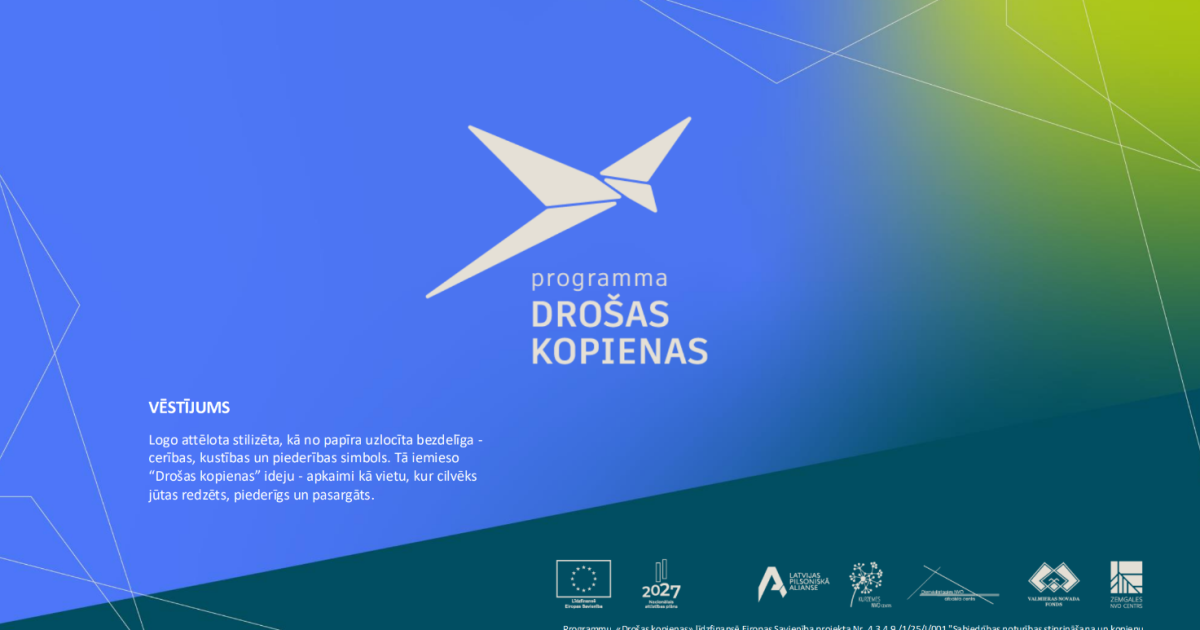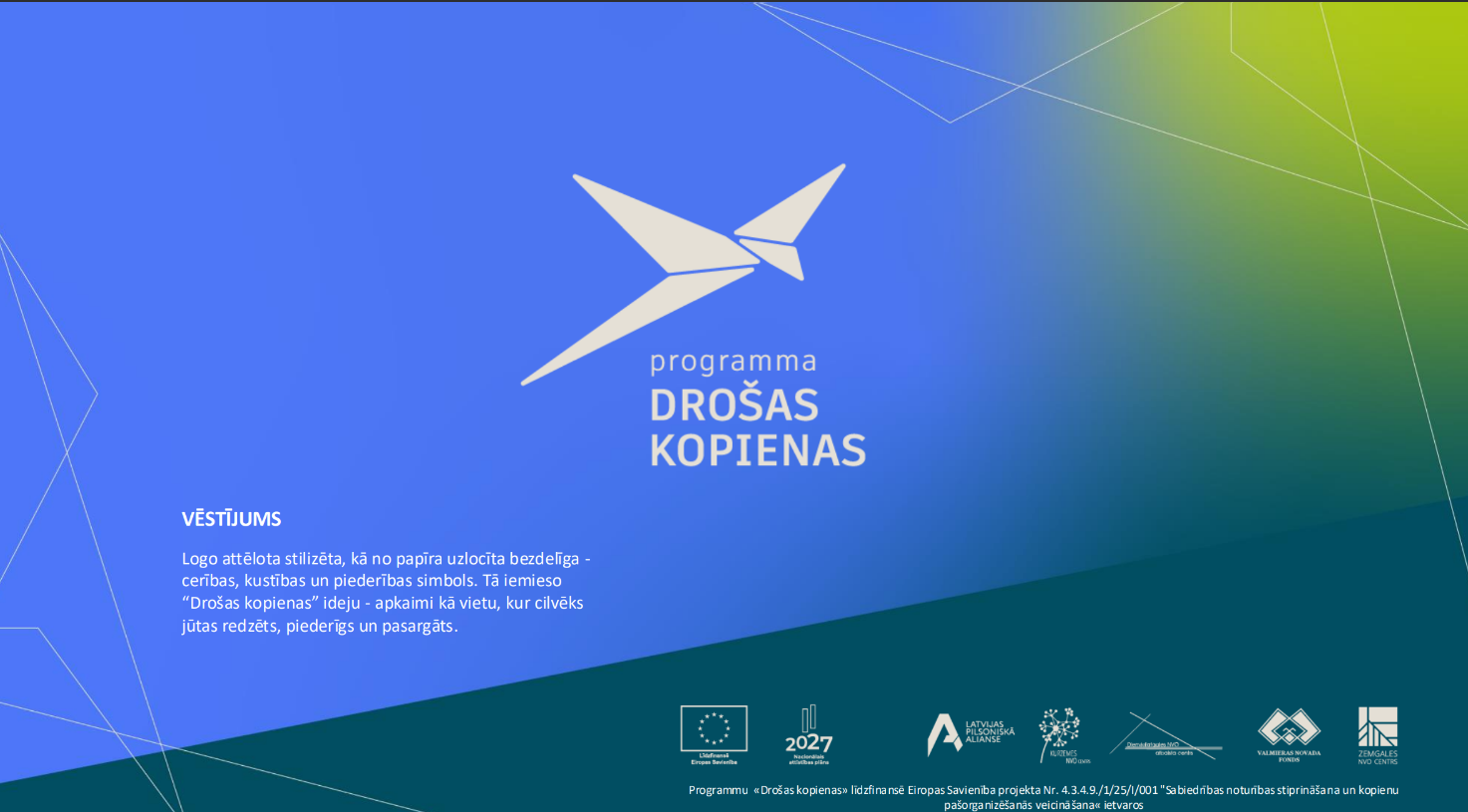 Programmu “Drošas kopienas” īsteno biedrība “Latvijas Pilsoniskā alianse” sadarbībā ar reģionālajiem partneriem – Dienvidlatgales NVO atbalsta centru, Kurzemes NVO centru, Valmieras novada fondu un Zemgales NVO centru. Programma ir daļa no projekta “Sabiedrības noturības stiprināšana un kopienu pašorganizēšanās veicināšana”, kuru līdzfinansē Eiropas Savienība un Latvijas valsts.