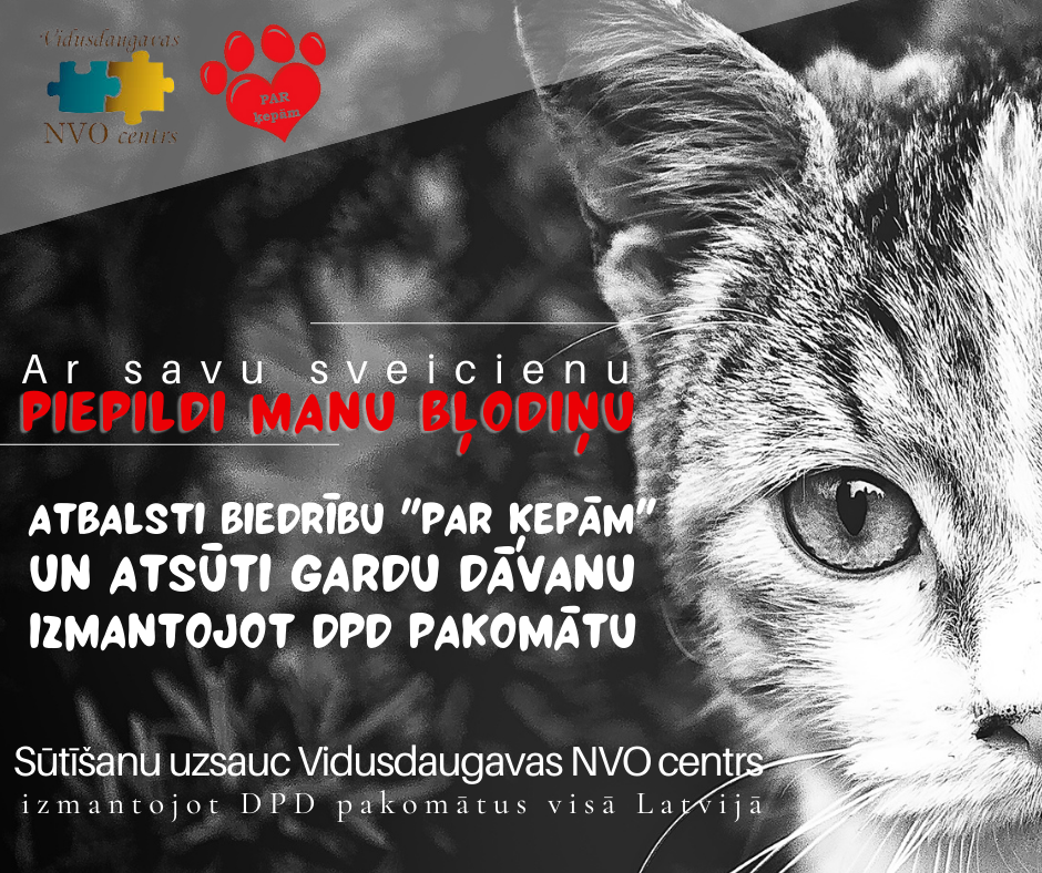 Biedrība "Vidusdaugavas NVO centrs" aizsāk akciju “Ar savu sveicienu piepildi manu bļodiņu”, lai atbalstītu biedrību "PAR ķepām". Šī ir vieta, kur satiekas cilvēki, kuriem rūp uz ielas nonākuši, pamesti vai nekad savu saimnieku nesatikuši kaķi. Tā ir vieta, kur tiek sniegtas pagaidu mājas, sadakterētas brūces un atgūta uzticība, pateicoties labsirdīgu cilvēku ziedojumiem un darbam. Ja arī Tev rūp šo kaķu likteņi un ir vēlme atbalstīt biedrību, aicinām iesaistīties. Tā ir iespēja no jebkuras vietas Latvijā bez maksas atsūtīt gardu sveicienu minčiem. Sūtīšanu ar DPD Latvija pakomātiem nodrošinās "Vidusdaugavas NVO centrs".