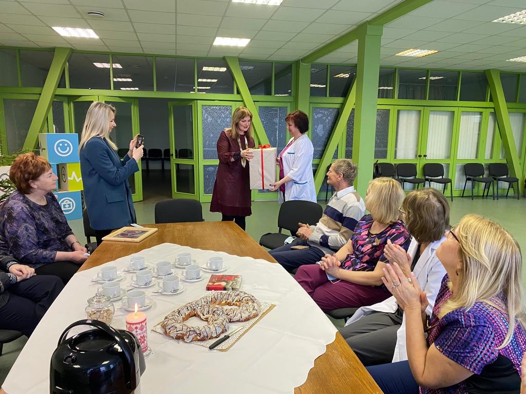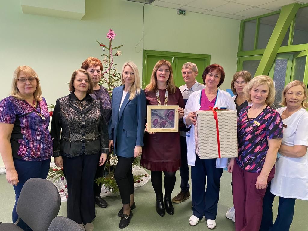 Slimnīcas vecākā māsa Māra Skrodele ciemiņus sagaidīja ar gardu biezpiena klinģeri. Pie kafijas galda bija aicināti dažādu nodaļu vadītāji, kurās ikdienā ārstējas bērni. Izskanēja siltas sarunas, novēlējumi nākošajam gadam gan ārstiem, gan ciemiņiem.