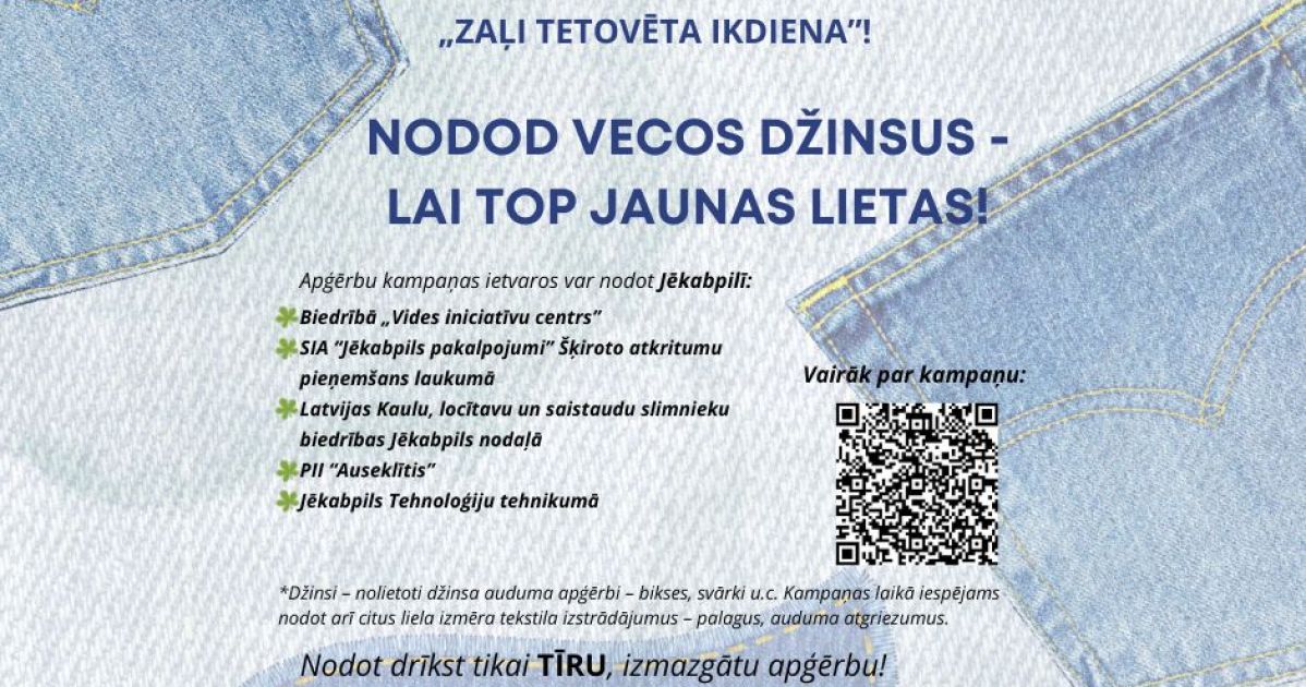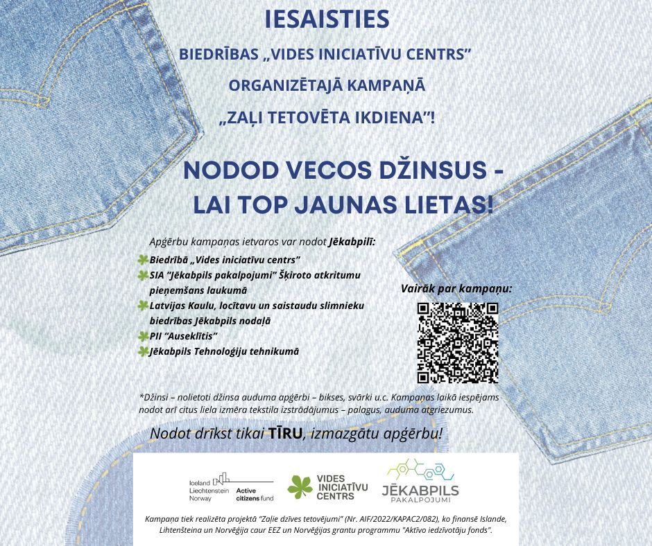 Biedrība "Vides iniciatīvu centrs" aicina piedalīties kampaņā: „Nodod vecos džinsus, lai top jaunas lietas!”