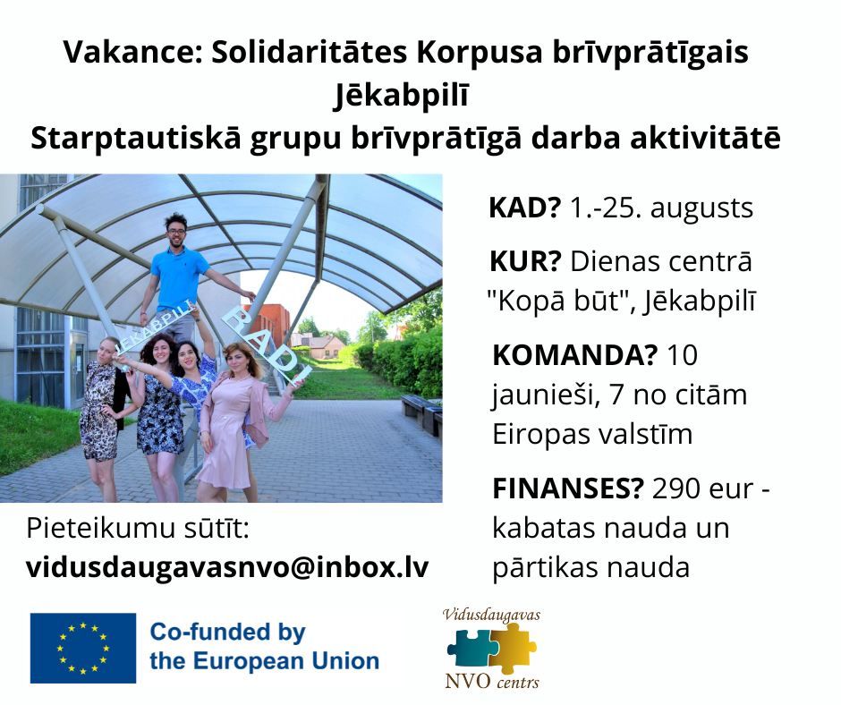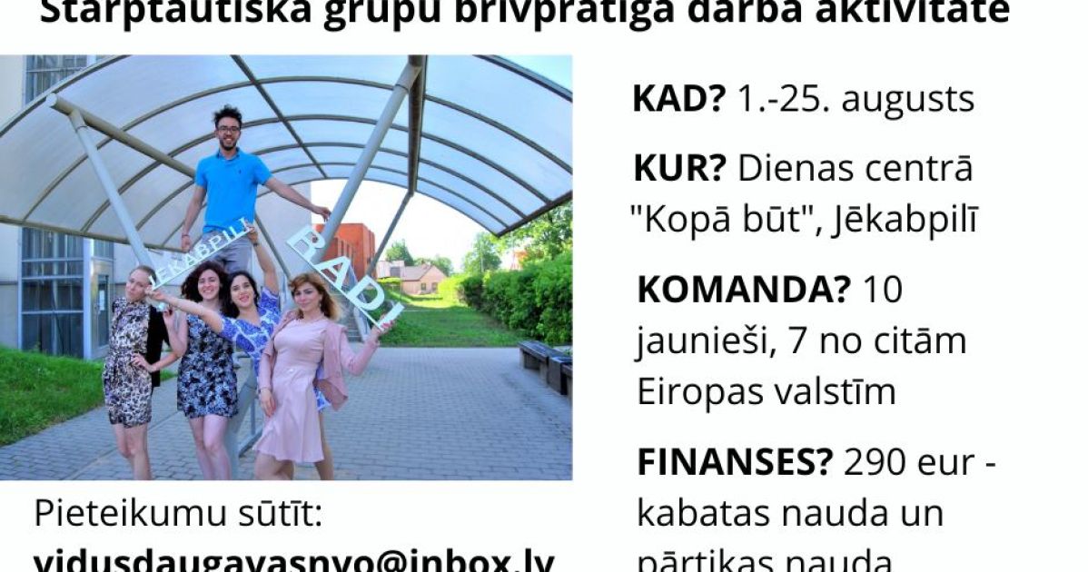 No 1. līdz 25. augustam Jēkabpilī pulcēsies 10 jaunieši no visas Eiropas un Latvijas, lai piedalītos brīvprātīgā darba aktivitātēs Dienas centrā "Kopā būt". Kopā mēs: