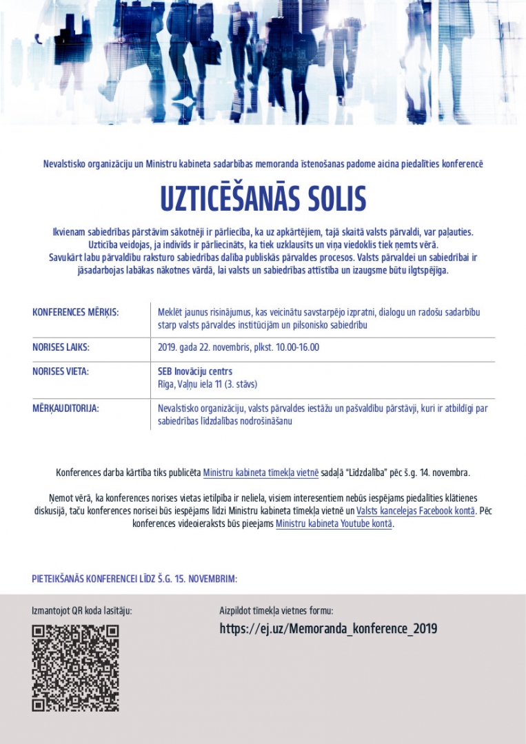 Nevalstisko organizāciju un Ministru kabineta sadarbības memoranda īstenošanas padome aicina piedalīties konferencē UZTICĒŠANĀS SOLIS Vidusdaugavas NVO Centrs 18.Novembris, 2019, 21:17 Jaunumi Atpakaļ Nākošais raksts