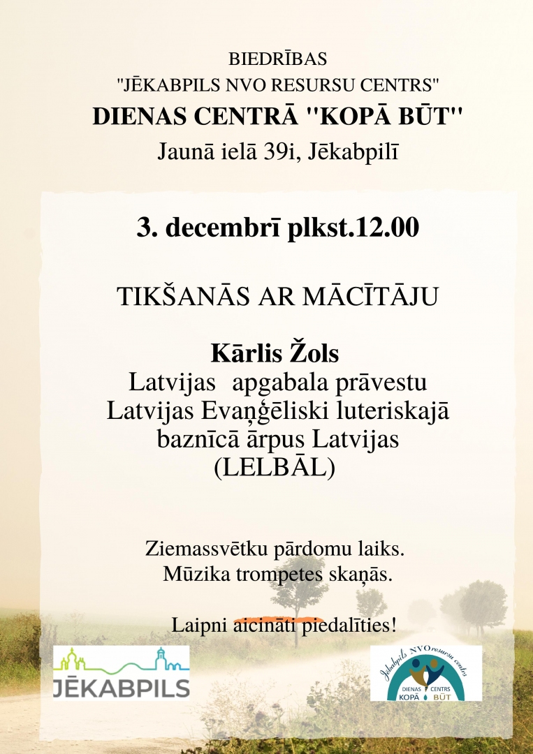 Tikšanās ar mācītāju Kārli Žolu Vidusdaugavas NVO Centrs 2.Decembris, 2019, 13:50 JaunumiDC Kopā būt Atpakaļ Nākošais raksts