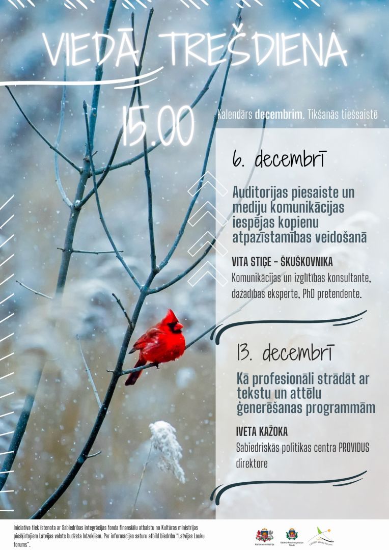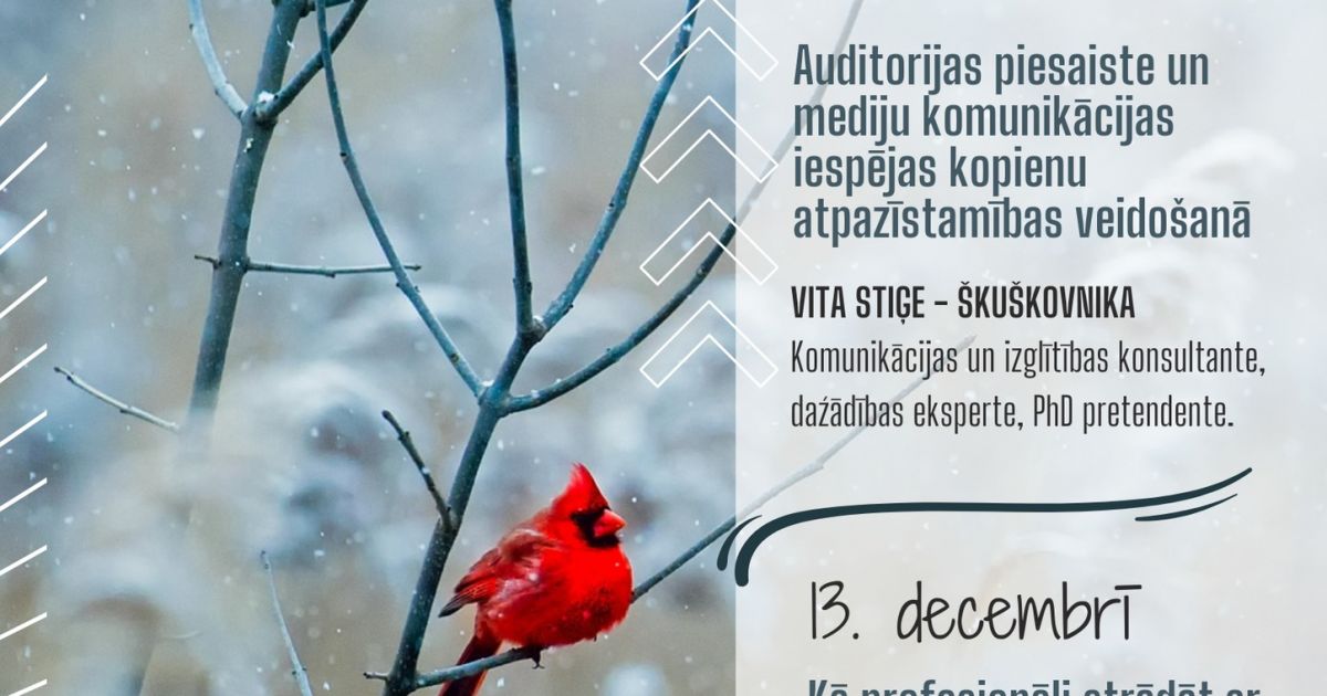 6. decembrī "Auditorijas piesaiste un mediju komunikācijas iespējas kopienu atpazīstamības veidošanā" Vita Stiģe - Škuškovnika, Komunikācijas un izglītības konsultante, daźādības eksperte, PhD pretendente.
