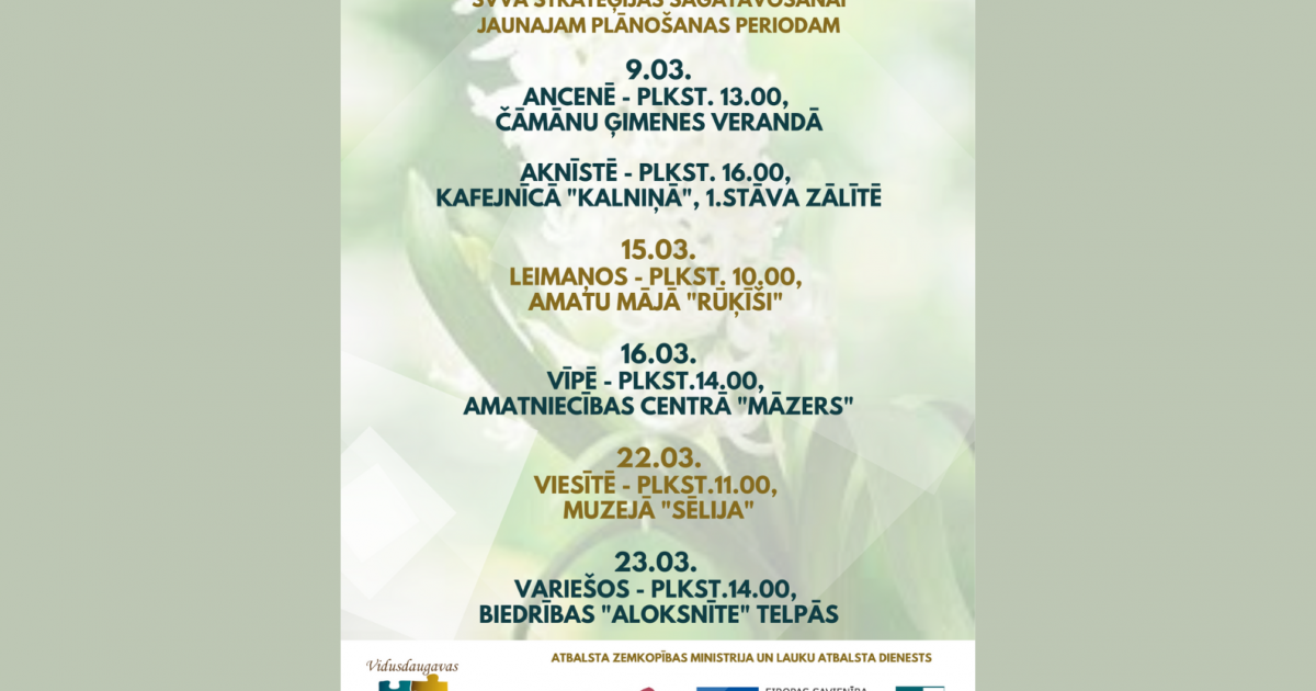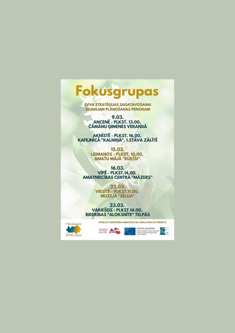 Pirmās iedzīvotāju un NVO fokusgrupas notiks 9. martā Ancenē - Čāmānu ģimenes verandā plkst 13.00 un Aknīstē kafejnīcā ''Kalniņā'' (1.stāvā) plkst 16.00;