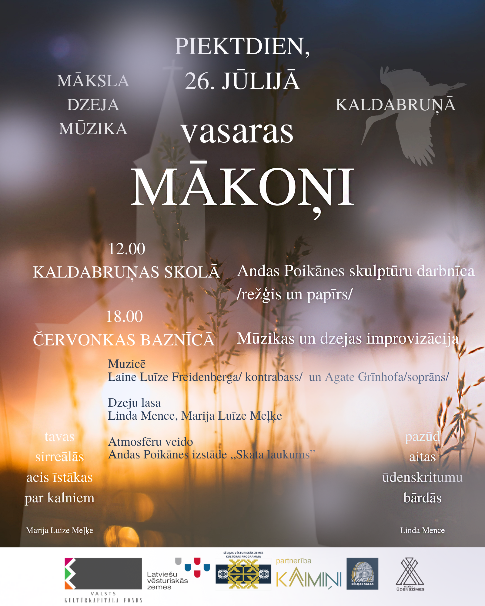 Tajā dzeju lasīs Linda Mence un Marija Luīze Meļķe, muzicēs Laine Luīze Freidenberga/ kontrabass/ un Agate Grīnhofa/soprāns/. Atmosfēru šim notikumam veido Andas Poikānes izstāde „Skata laukums”.