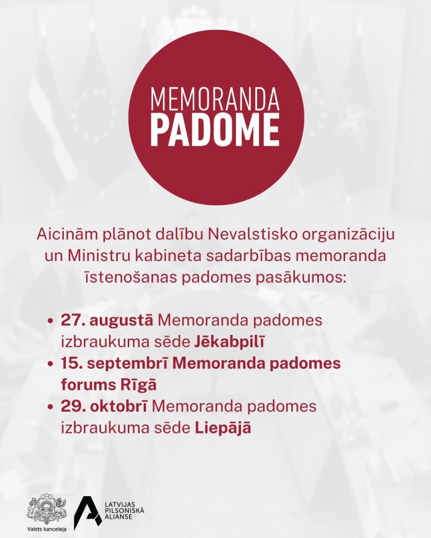 Šogad plānotas divas Memoranda padomes izbraukuma sēdes – 27. augustā Jēkabpilī un 24. oktobrī Liepājā, kā arī Memoranda padomes forums 15. septembrī Rīgā. Papildus informēsim par nākamo iespēju nevalstiskajām organizācijām pievienoties memorandam.