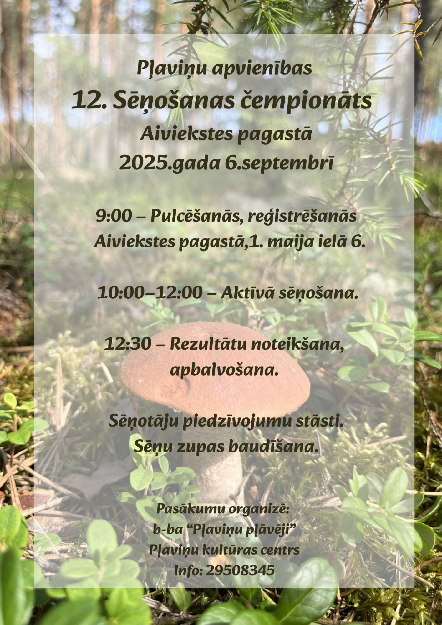 Abi pasākumi notiks Aiviekstes pagastā, 1. maija ielā 6, un dalībniekiem būs iespēja ne tikai sacensties sēņu vākšanā, bet arī baudīt meža noskaņu, klausīties piedzīvojumu stāstos un kopā nogaršot sēņu zupu.