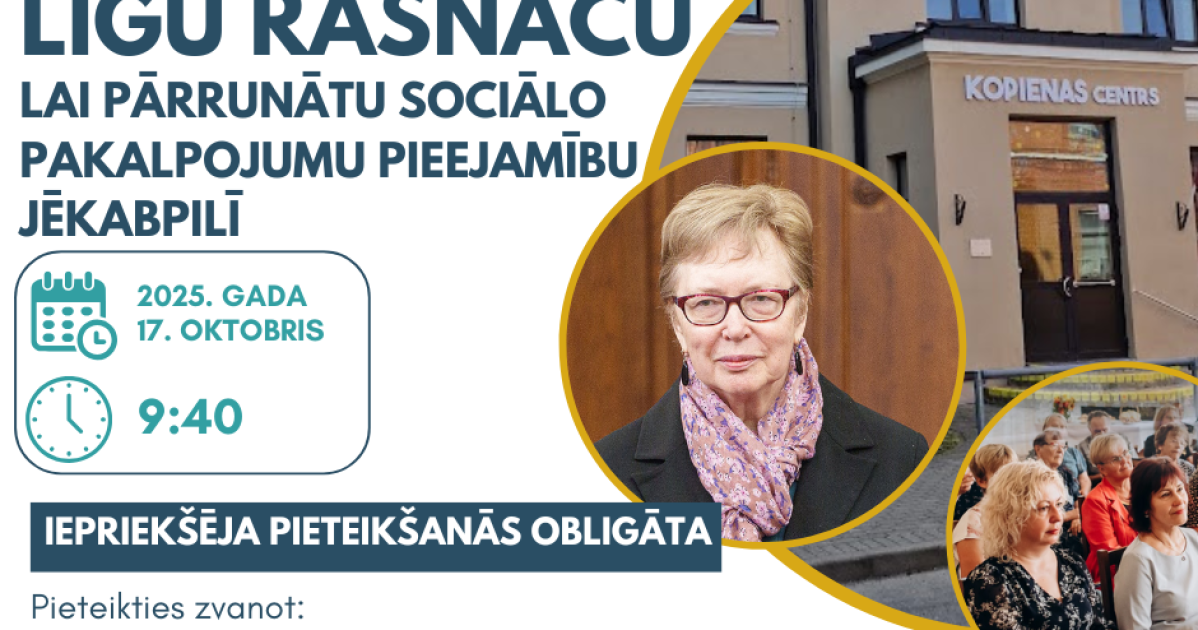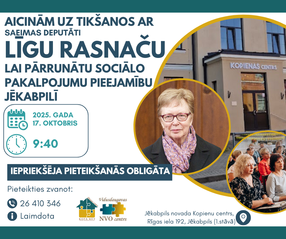 Aicinām Jēkabpils novada aktīvos iedzīvotājus un nevalstiskā sektora pārstāvjus uz sarunu ar Saeimas deputāti Līgu Rasnaču, lai pārrunātu sociālo pakalpojumu pieejamību un attīstību Jēkabpilī. Tikšanās notiks 2025. gada 17. oktobrī plkst. 9.40 Jēkabpils novada Kopienas centrā (Rīgas iela 192, 1. stāvā).