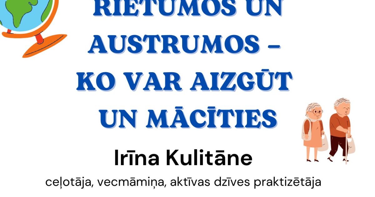 Projekta “Trešās paaudzes universitāšu tīkla izveide Latvijā” ietvaros tiek organizēts izglītojošs pasākums senioriem par dzīvesveidu un pieredzi dažādās pasaules kultūrās. Lekciju vadīs Irīna Kulitāne – ceļotāja, vecmāmiņa un aktīvas dzīves piekritēja, kura dalīsies savos iespaidos un zināšanās par senioru dzīvi Rietumos un Austrumos.