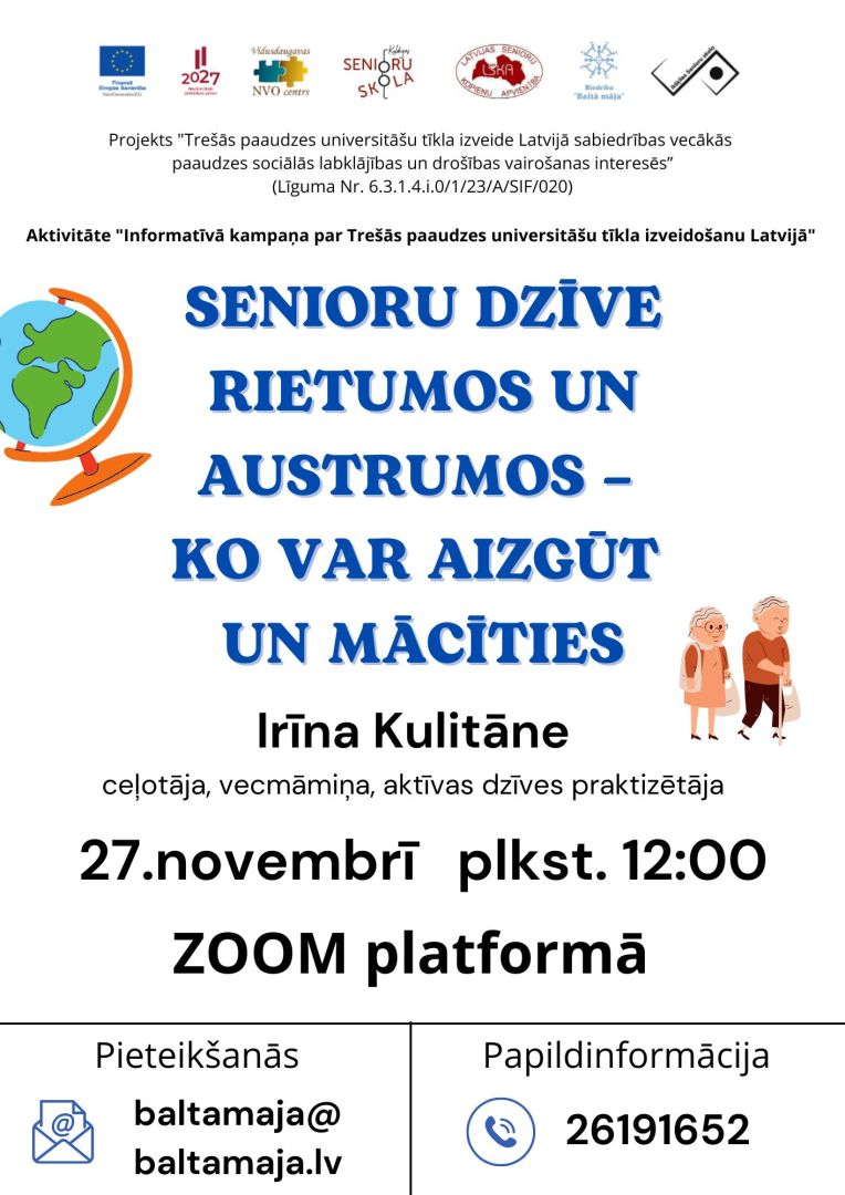 Aicinām uz tiešsaistes lekciju senioriem: “Senioru dzīve Rietumos un Austrumos – ko var aizgūt un mācīties”