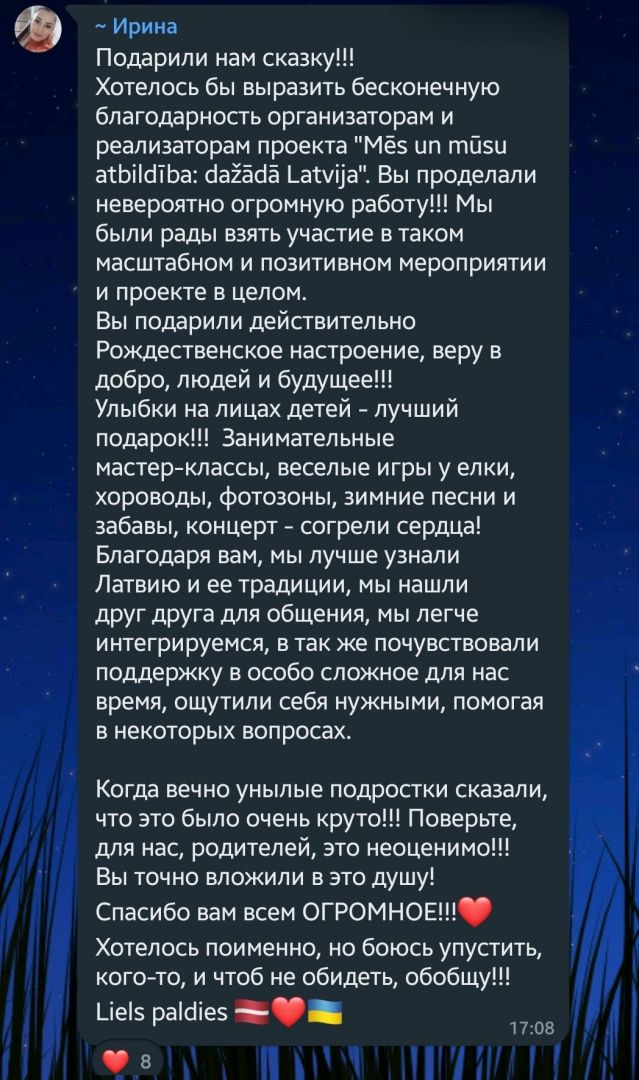 Pēc Ziemassvētku gaidīšanas pasākuma un citām aktivitātēm varam teikt, ka ir uzlabojusies Ukrainas civiliedzīvotāju izpratne par Latvijas sabiedrības tradīcijām, kultūrvēsturiskajām vērtībām; uzlabojušās ikdienā lietojamās latviešu valodas prasmes; uzlabojusies Ukrainas civiliedzīvotāju un Latvijas iedzīvotāju saskarsmes spējas un sadarbība.