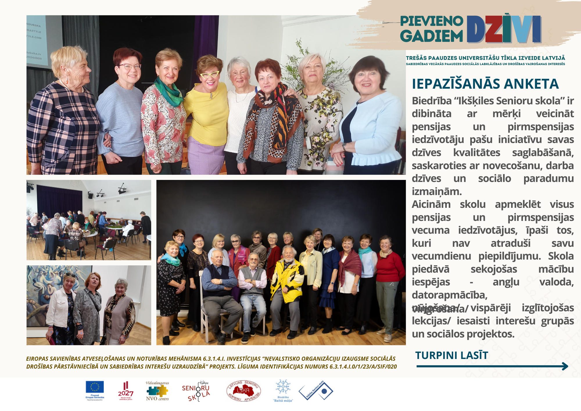Aktivitāte tiek īstenota projekta "Trešās paaudzes universitāšu tīkla izveide Latvijā sabiedrības vecākās paaudzes sociālās labklājības un drošības vairošanas interesēs”ietvaros, ko finansē no Eiropas Savienības Atveseļošanas fonda un valsts budžeta līdzekļiem.