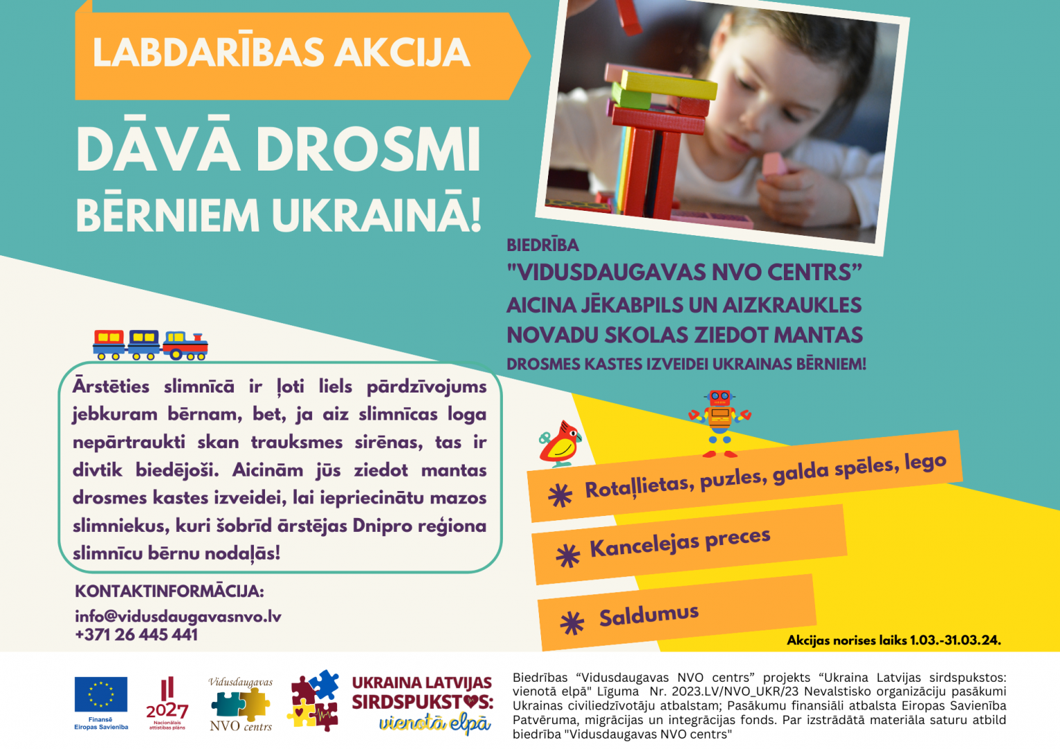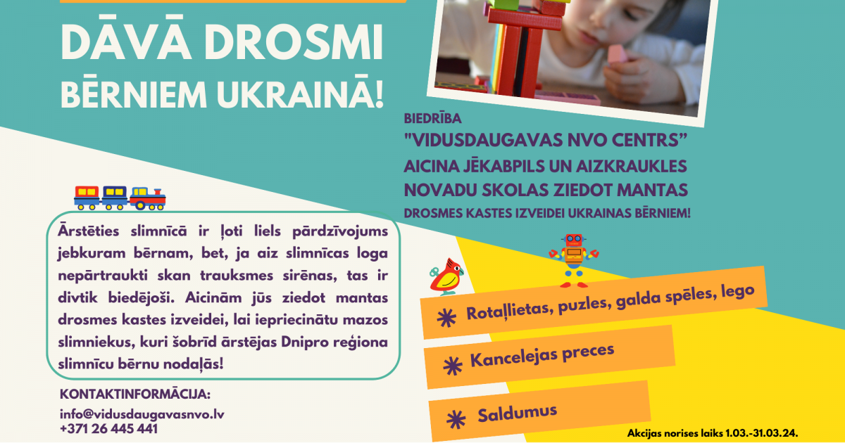 Biedrība "Vidusdaugavas NVO centrs" aicina Jēkabpils un Aizkraukles novadu skolas piedalīties labdarības akcijā "Dāvā drosmi bērniem Ukrainā!", lai izveidotu drosmes kasti bērniem, kuri šobrīd ārstējas Dnipro reģiona slimnīcu bērnu nodaļās!