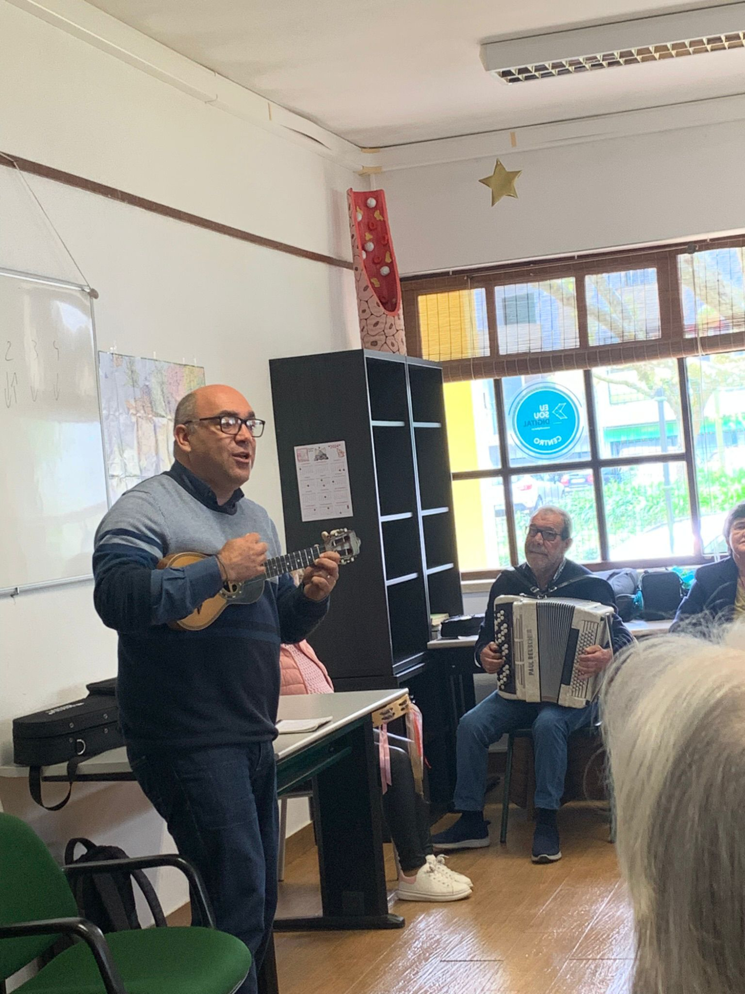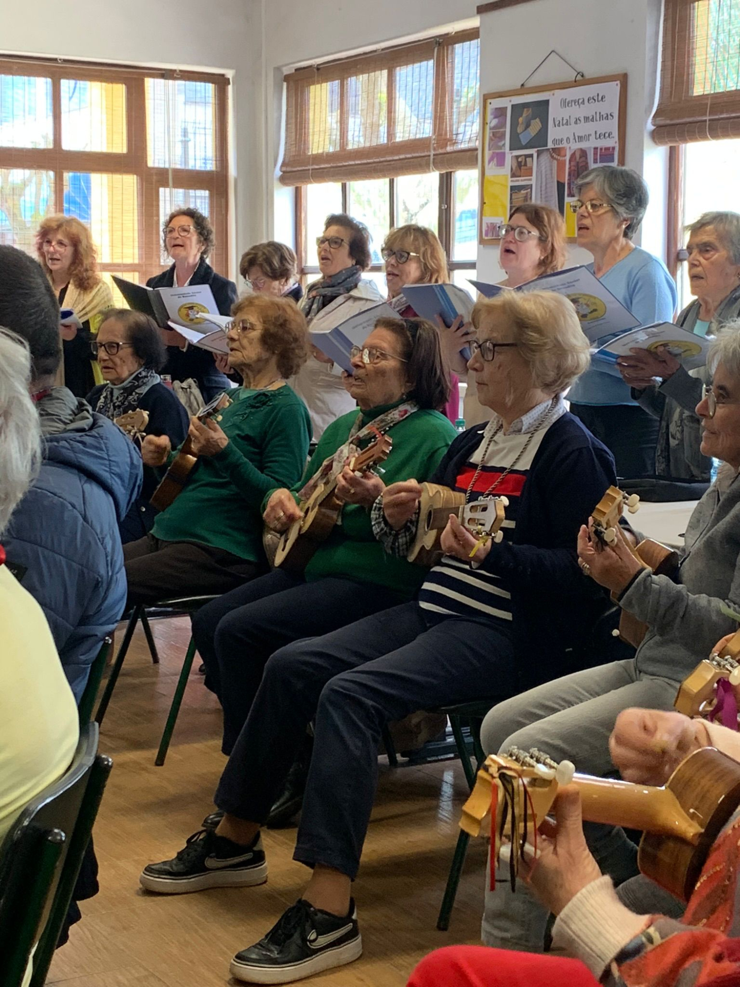 Zāles telpā sastopam jau iepriekš satikto diriģentu Bruno, kas arī šeit senioriem māca ukuleles spēli un dziedāšanu. Šoreiz mēģinām organizēties “Pūt, vējiņi!” dziedāšanai, bet portugāļiem tas šķiet par lēnu, un mēs nobeidzam ar ko jestrāku! Mūsu galvenais secinājums te – svarīgi, lai pasniedzējs iedvesmo nodarbību apmeklētājus apgūt to, ko pats prot un māca citiem!