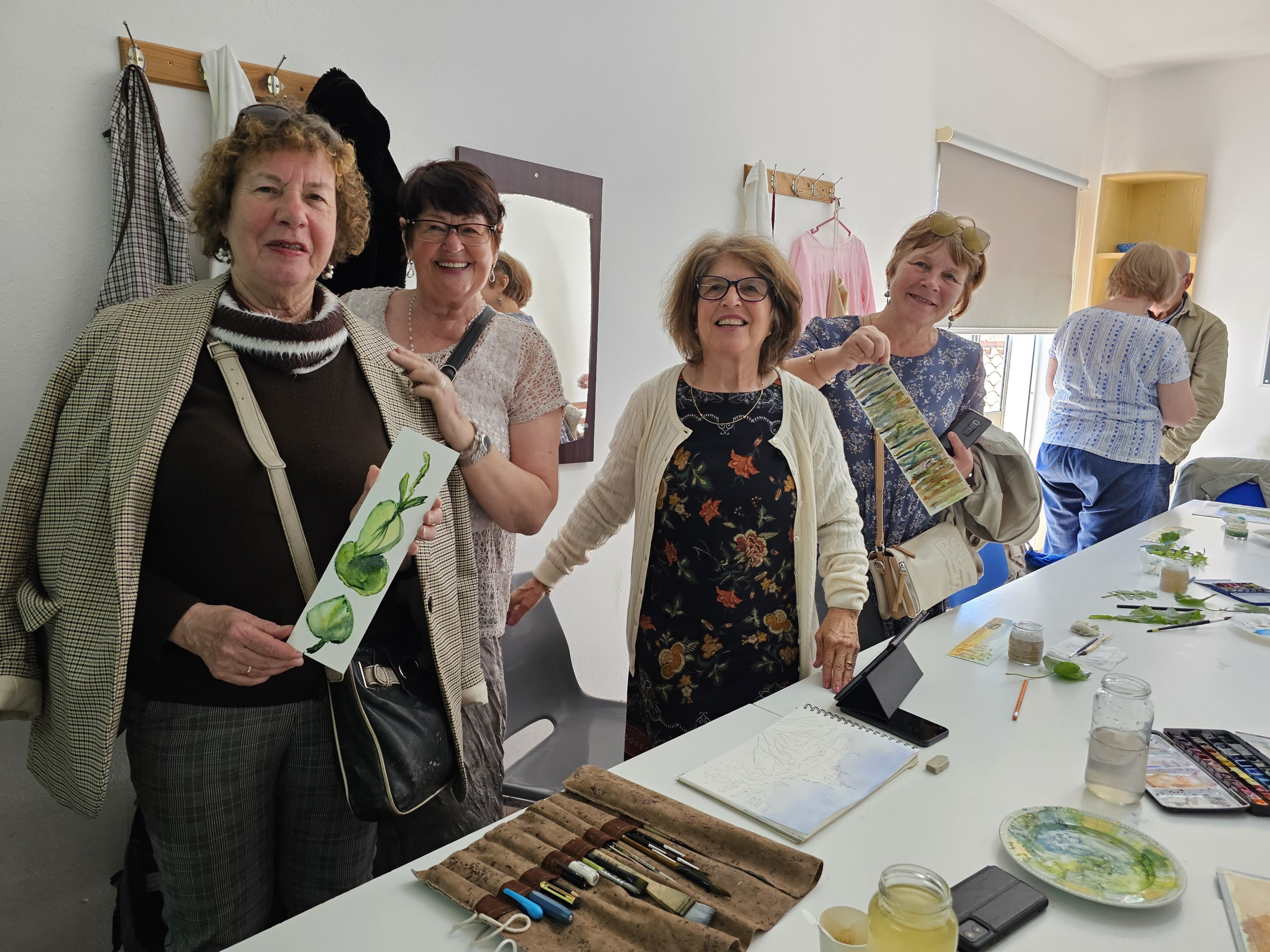Ceturtdiena, 11. aprīlis, rīta pusē tā paagrāk braucam ar satiksmes autobusu uz Pattaya pilsētiņu. Šeit ir neliela senioru kopa ciematā, kas darbojas vietējās bibliotēkas ēkā, bet uz nodarbībām iedzīvotāji brauc arī no attālākiem lauku rajoniem. Šeit kārtējo reizi pārliecināmies, ka iedvesmojošs pasniedzējs var visu! Un ka māksla vieno – plecu pie pleca zīmē portugāļu un latviešu seniori. Ne vieni, ne otri nav īpaši lieli valodas pratēji, bet sarunājas visu laiku! Atzīstami, ka nodarbībās visur manāmi arī vīrieši – to mēs īpaši novērtējam kā bonusu, kas veido nodarbību pievilcīgu gaisotni.